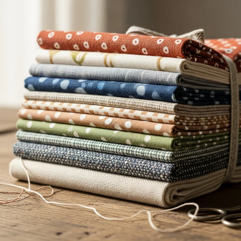 Curated selection of premium fabrics including cotton, linen, and specialty textiles. Each bundle contains 10 different patterns and colors, each measuring 1 yard. Ideal for sewing, quilting, and textile art projects.